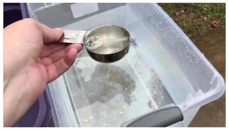 For a bin that holds 30 quarts, add just ¼ cup of soap. Mix it well in the warm water by hand without making many bubbles. Add ¼ cup of white vinegar to the second bin. Apple cider vinegar can work in a pinch, but it could potentially affect the overall color of a white-feathered bird.