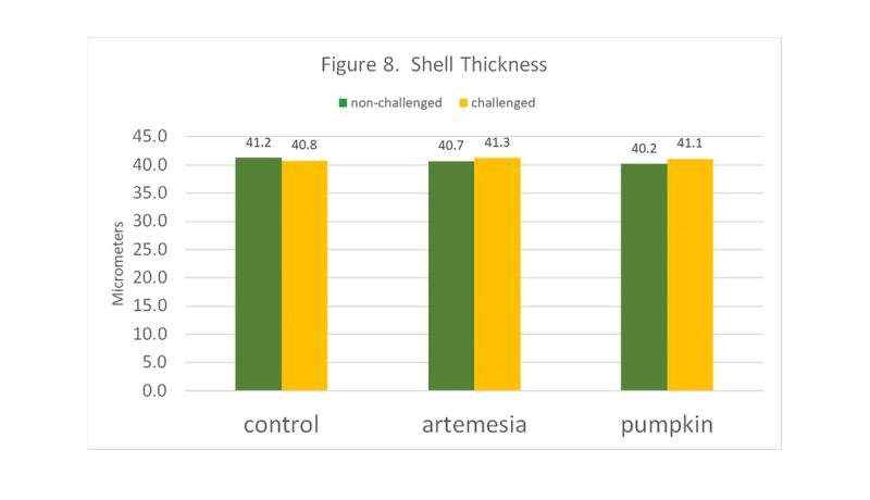 Lastly, Figure 8 indicates that the thickness of shells was measured. This is an important measurement because ingredients that cause shells to be thinner are likely to cause eggs to be lost in transport to the customer. In addition, thinner shells are more likely to have a higher percentage of moisture loss which translates to eggs that depreciate in interior quality faster.