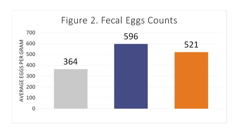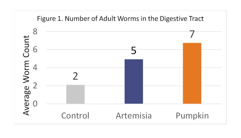 There was no statistical difference between any of the groups (Figure 1). So that means that the treatments of wormwood and pumpkin seed did not affect the number of adult worms in the gut. Unchallenged layers—the control group—did not have any adult worms in their digestive tract, either.