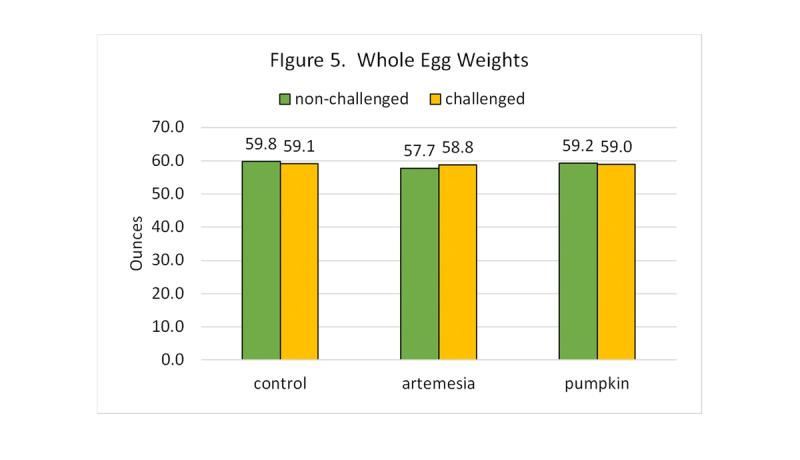 Figure 5 illustrates that the egg weights were not significantly different in any of the treatment groups—the tested ingredients did not appear to harm egg weights or egg size. Also, chickens challenged with roundworms did not appear to affect the size of the eggs laid.