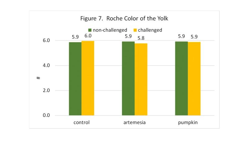 Figure 7 shows the yellowness or orange color of the yolk by assigning the color a number on the Roche color scale. A lower number is more of a pale yellow and a higher number is more orange. This was interesting to see since both the wormwood and pumpkin seed had the potential to add carotenoid pigments to the diet, therefore potentially making the yolks darker. The results indicate that there is no significant difference between yolk color in any of the treatment groups.