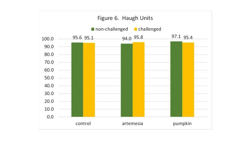 Figure 6 shows the Haugh Units, which is a measurement of the quality of the albumen or egg white, meaning its ability to perform adequately in recipe expectations and functional properties. It does not appear to harm the egg white protein and quality when adding wormwood or pumpkin seed into the diets. Also, the chickens being challenged with roundworms did not appear to affect the Haugh unit of the eggs.