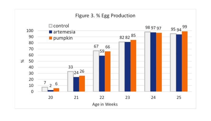 Figure 3 looks at the hens’ egg production before they were infected with roundworms. Until birds were 24 weeks old, the control group led the way in egg production. Egg production did not differ significantly among treatment groups, so it appears that adding wormwood and pumpkin seed did not have a negative effect.