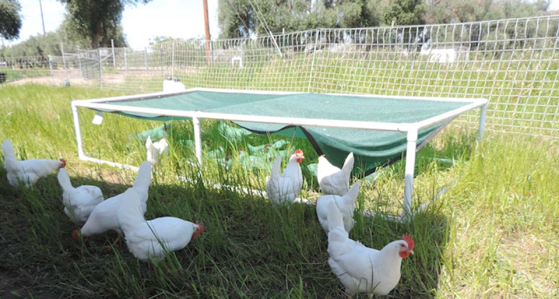 Example of a portable shade structure that is easy and easy to build. Based on personal experience, shade cloth that blocks 90% of the sun does the trick in the hot California sun. Find more information on how to build them at: https://ucanr.edu/sites/poultry/files/236853.pdf.