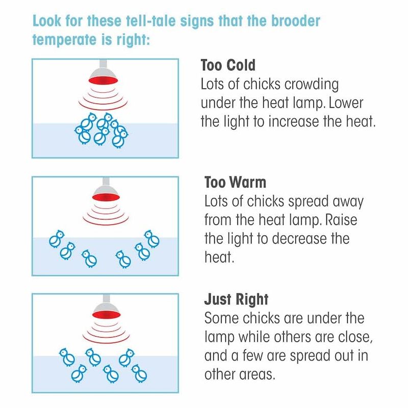 Your birds need to have room to move to cooler spaces if they get too warm, but that all birds can comfortably sit under the heat source. If using a heat lamp, consider a red bulb that will provide enough light for the young chicks to see their food and water but is not so bright to keep them awake.
