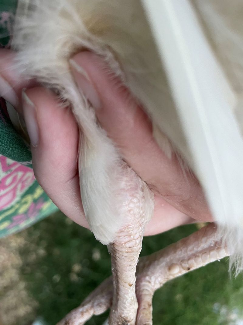 When your chickens go to roost at night, the mites come out and crawl along the roost to find the host. They crawl up the legs to the point where the scales on the legs end and the feathers begin. The skin there is not protected by scales and quite often this is where the mites will bite the bird. That does not mean that they will not travel up to the breast or thigh areas and drink there.