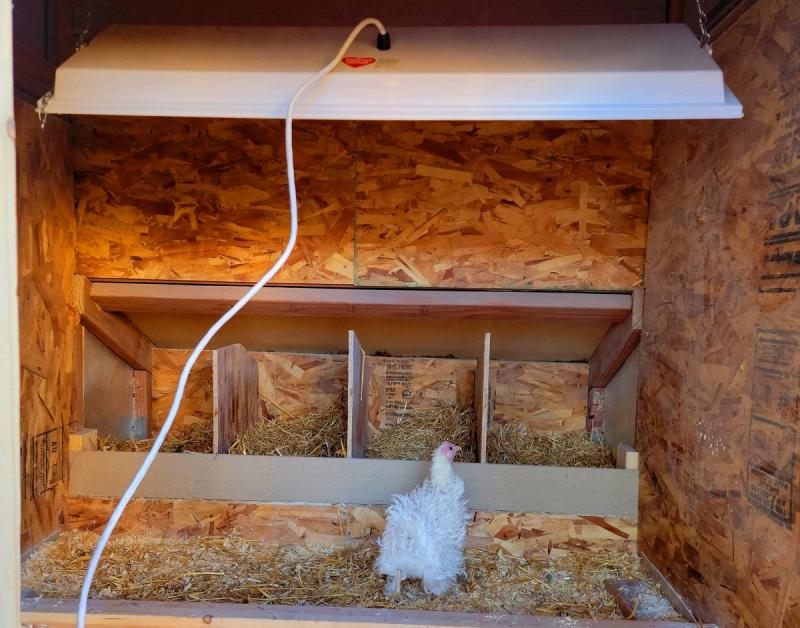 The heater itself is super straight-forward to set up. I simply popped the panel out of the box, attached the included chains and hangers and hung the heater from 2 hooks I had previously screwed into my roost. The heater is very lightweight, only 7 pounds, so I didn’t require anything heavy duty.