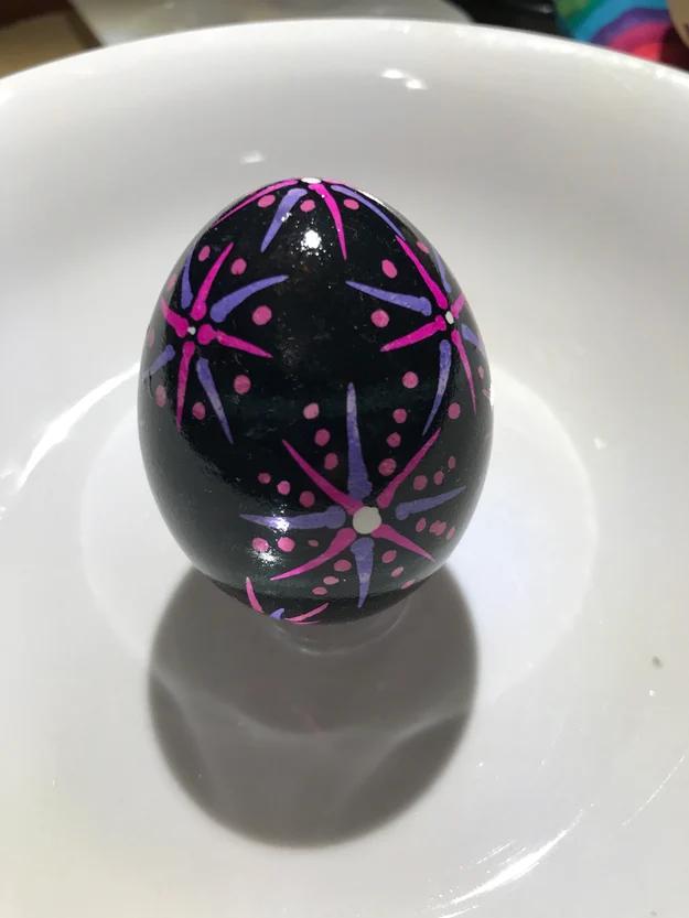 The most famous egg artform is Pysanky or Pysanka (singular form), meaning one egg decorated in the traditional Ukrainian method using traditional designs. A combination of wax and dyes are used to mark decorative lines or symbols on an egg.