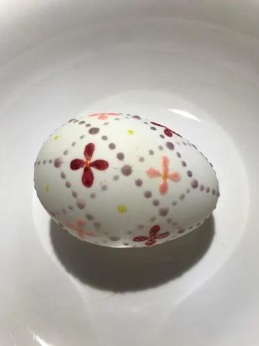 You usually start by marking out patterns in pencil on a white-shelled egg. Then you use a kitska (more on that in a moment) to draw on top of those lines with wax. Since the shell is white, any lines you cover with wax will remain white.