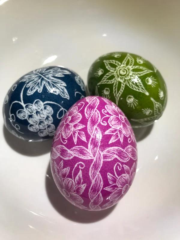 Using the kitska mentioned above, you can melt Crayola-brand crayons and draw on the shells. This only really works with Crayola because they have the right blend of waxes and pigments. You can also melt the crayons in old metal tealight tins over a candle warmer to melt the wax. Then you can use the nail dotting tool also mentioned above for doing colorful drop pull on eggs. Again, this is an affordable solution and great beginner method for youth who may be interested in building their skills in easter artwork. To get a better understanding of this style, you can visit EggstrArt on Etsy to see examples or to get dyed wax.