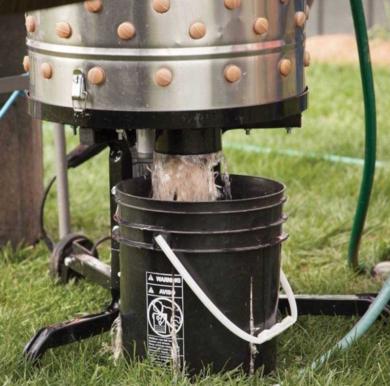 My husband came over to take a look and figured out that the Plucker was on a slight downhill angle, and this was allowing water to run directly on the motor. As a built-in safety measure, it shut off so we wouldn't be harmed. My husband turned the machine around to allow the water to flow away from the motor, hit the motor's reset button, and turned the Yardbird back on—it was working! It sounded fine, so we tried it out.