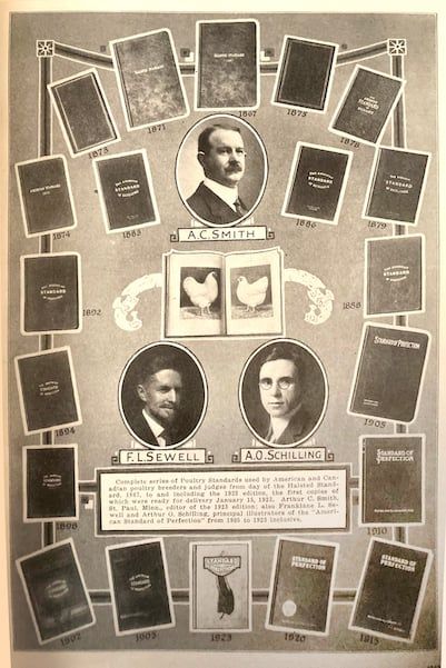 Most of the illustrations were unsatisfactory, but that changed with the 1905 edition. Since then, every edition has included many illustrations of the ideal specimen. Several talented poultry artists emerged. The most recognized is Arthur O. Schilling.