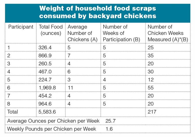 Participants weighed the household food scraps they fed to their backyard chickens. The total weight of the food scraps was summed for the five weeks studied. The average number of backyard chickens was determined for each participant and multiplied by the number of weeks the participant was in the study. The result is the average weight of household food scraps that a backyard chicken can be expected to consume in a week. The average expected weekly consumption was then multiplied by 52 to provide an estimate of the average expected annual consumption.